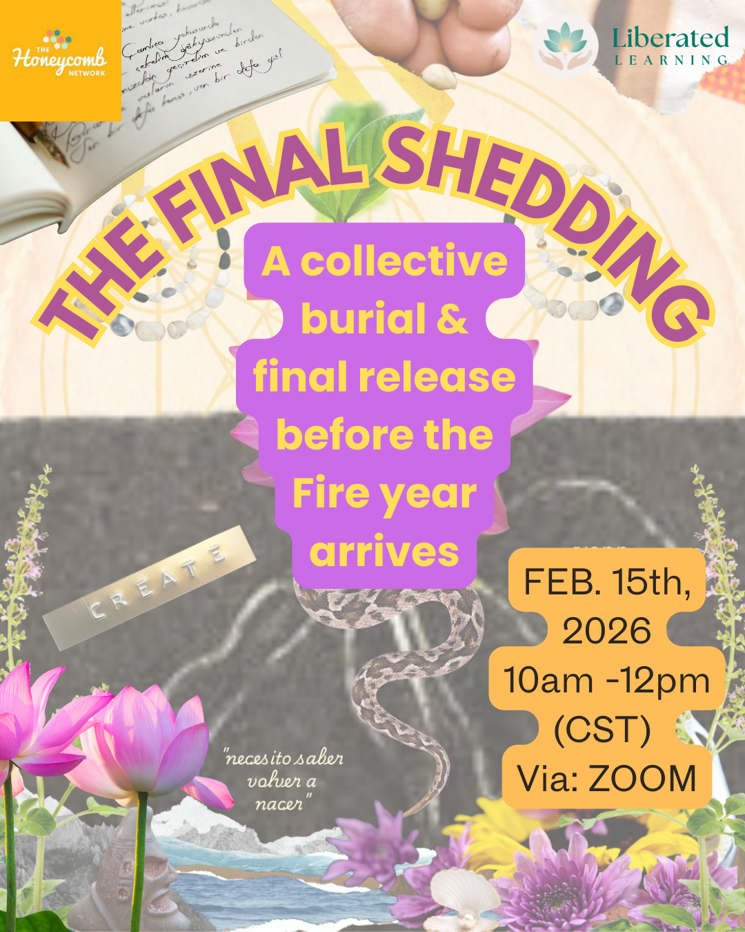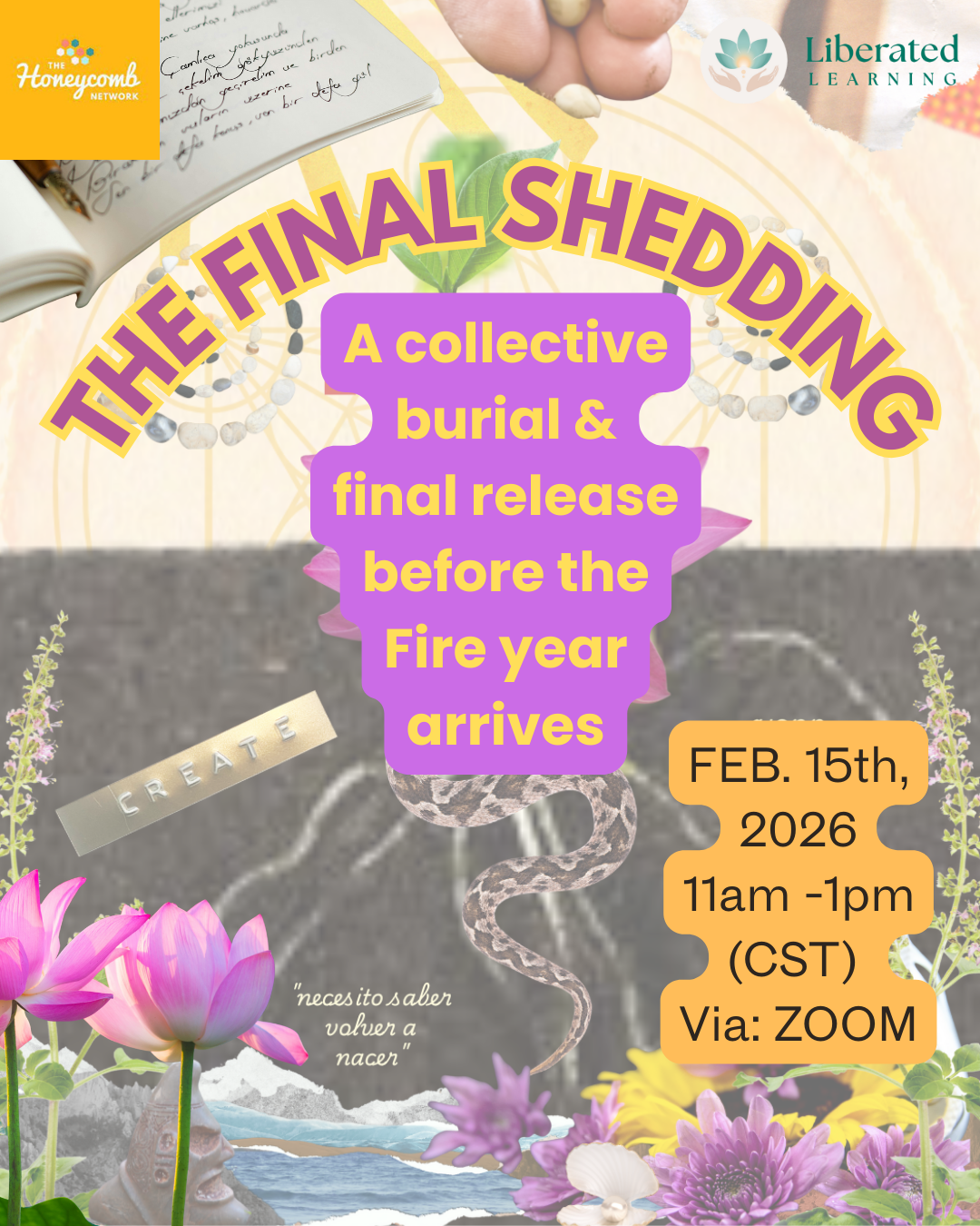 The Last Shedding is a somatic and ritual container rooted in the Embodied Alchemy framework, co-created through The Honeycomb Network and Liberated Learning. Together, we work with endings as fertile ground, returning what has completed its cycle back to the earth so it may transform and nourish what comes next.
